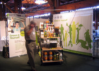 Green Festival is America’s longest-running sustainability and green living event with 1,000,000+ visitors. Exhibiting there is exhilarating and inspiring, a great training ground for the pop-up shops I’ve done since. It’s also challenging when it comes to displaying product, it’s got to be green, right? For Plan-It Hardware, a company bringing greener choices in DIY products to communities in California, an REI store fixture rescued from their dumpster was perfect (and free) – an appropriate extension of the tagline we created for them; “Green it Yourself”.